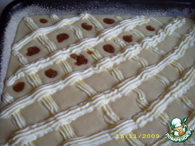 Листик поглубже вымазать холодным маслом или маргарином. Посыпать панировочными сухарями. Вылить в него тесто. На тесто нанести решетку из творога. В образовавшиеся ромбики положить повидло. Выпекать около 30 мин.