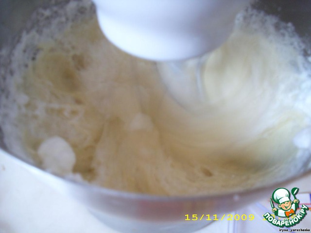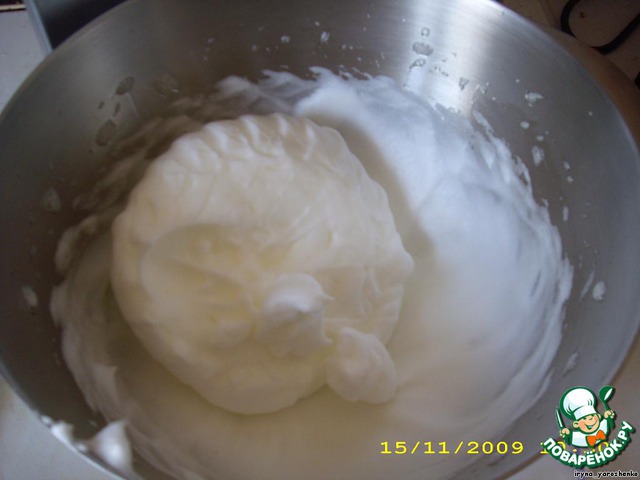 Теперь приступим к тесту. Оставшиеся 4 яйца разделить на белки и желтки. Белки взбить в крепкую пену.