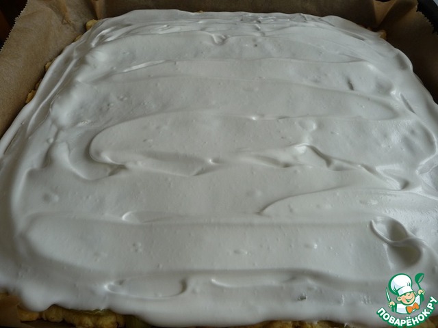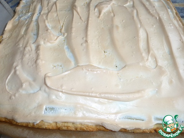 Через 20 мин., на горячий пирог выложить безе произвольно. Если выложить с помощью кулинарного шприца, будет красиво и празднично.