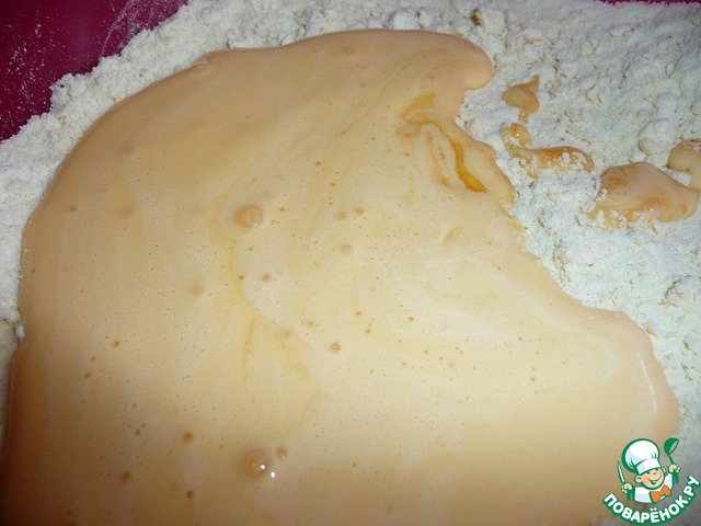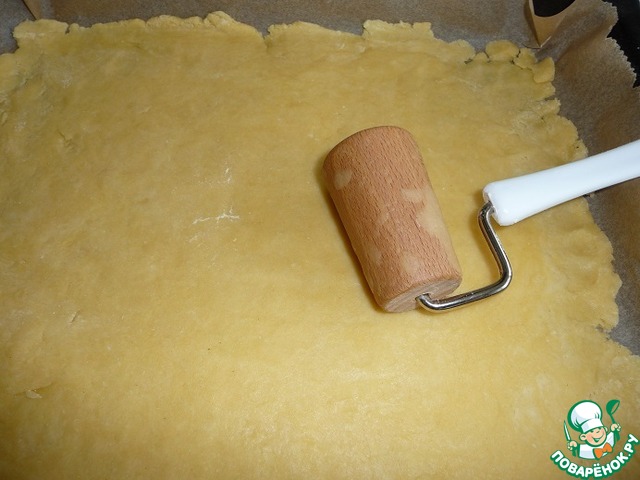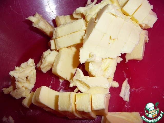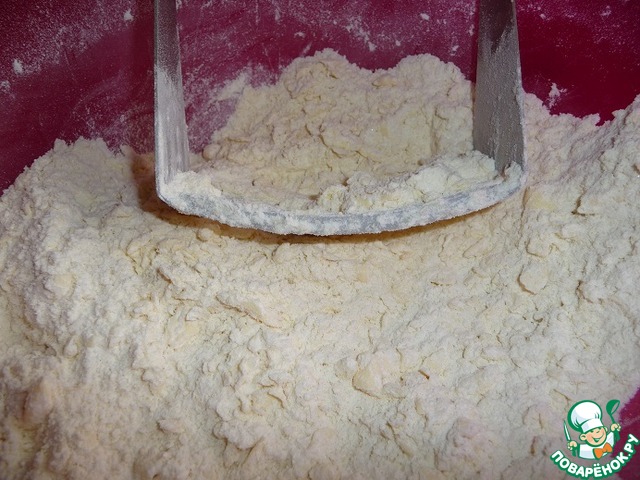 В муку добавить разрыхлитель теста, просеить. Смешать с маслом. Хорошо порубить. Я смешиваю с помощью специального резака.