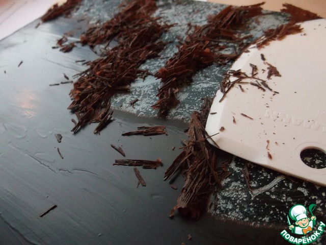 Тем временем, шоколад на доске (противне) уже затвердел и мы можем с помощью шпателя снять тонкую стружку.