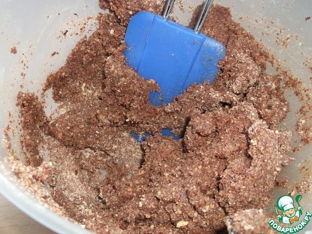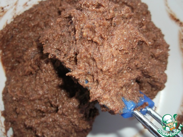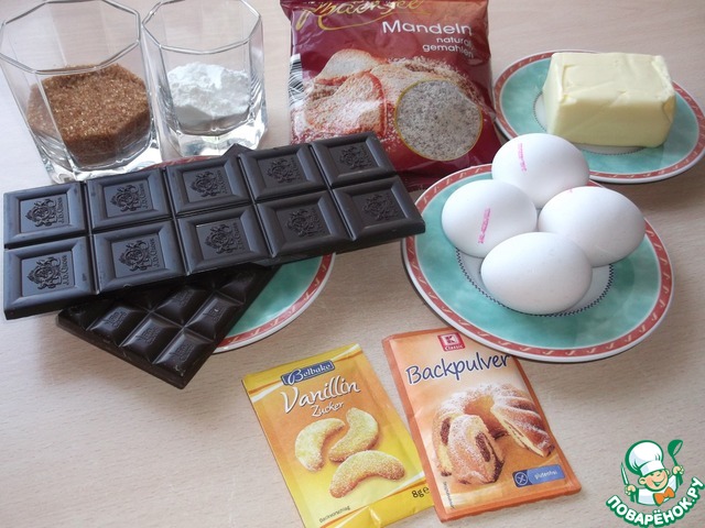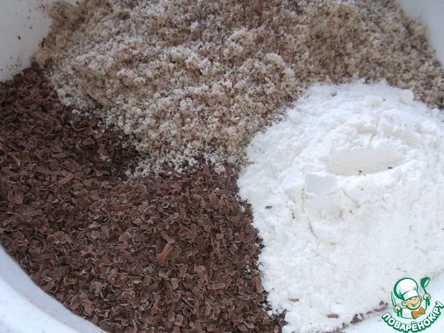 Миндаль, муку, разрыхлитель и, измельчённый на тёрке шоколад, перемешать.