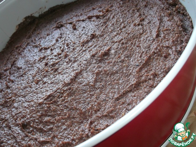 Выкладываем наше тесто в форму, застеленную бумагой для выпечки (диаметр формы 26 см ). Аккуратно разравниваем.