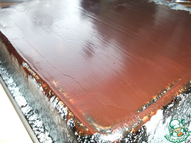 3 ст. л. жидкого шоколада тонко наносим на мраморную доску или как у меня - на тыльную гладкую сторону небольшого противня.