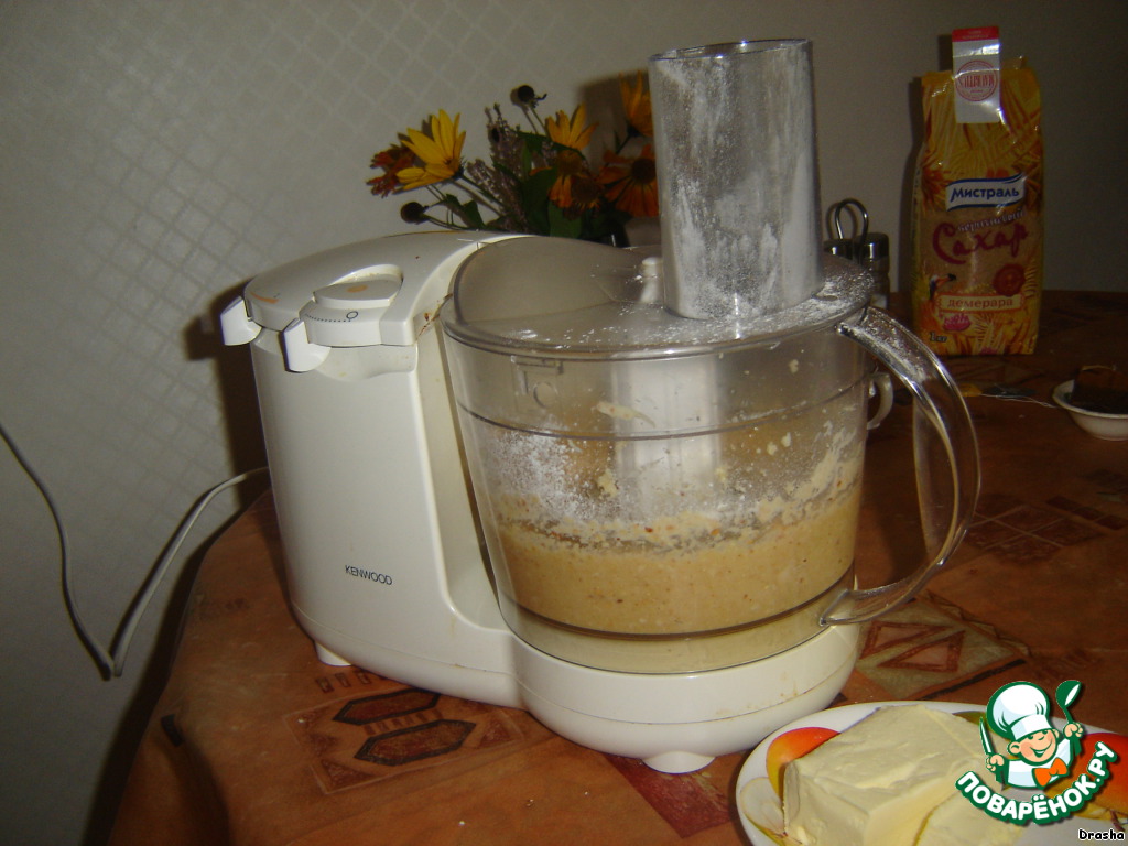 Делаем ореховую начинку. Взбиваем масло с сахаром, добавляем яйца, затем орехи и муку, взбываем в блендере. Коричневый сахар придаст начинке нежный вкус карамели.