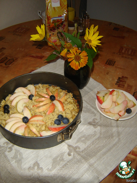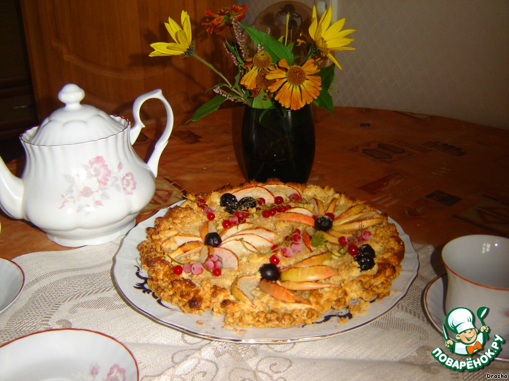 На остывший корж выкладываем ореховую начинку, украшаем яблоками и фруктами (ягодами), крошкой из остатков теста. Выпекаем при 180 градусах 30 минут.