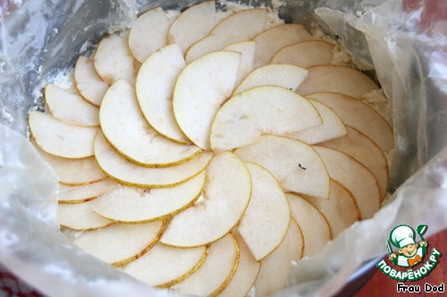 У груш удалить сердцевину, нарезать мякоть тонкими ломтиками. Выложить на пирог.