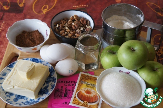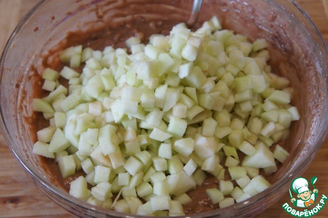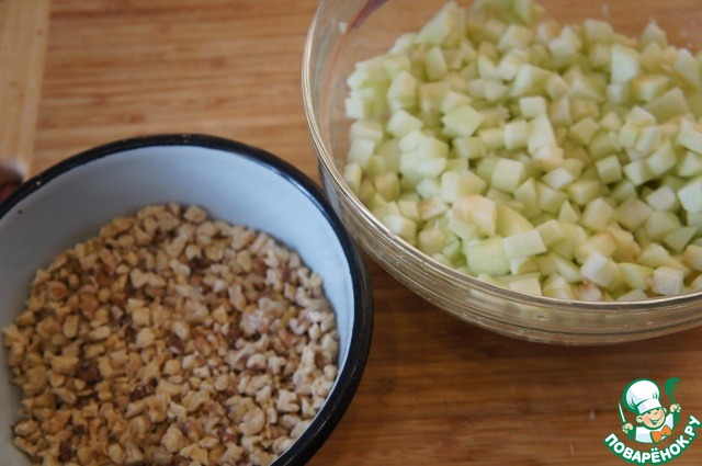 Яблоки очистить, нарезать кубиками, залить ромом и отставить. Орехи крупно нарубить (я просто поломала их пальцами).