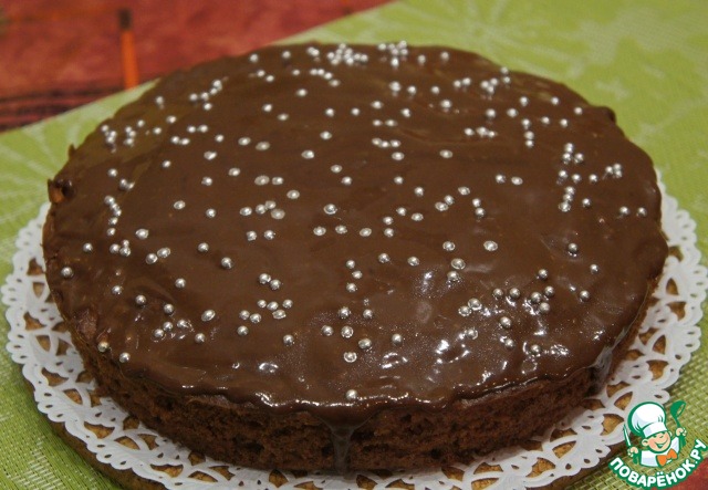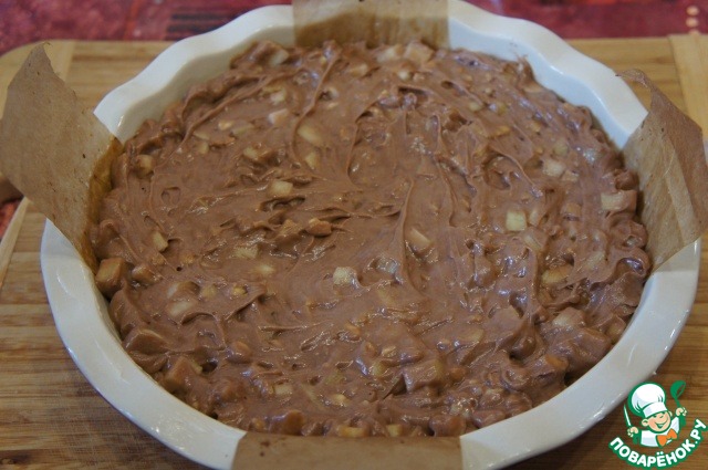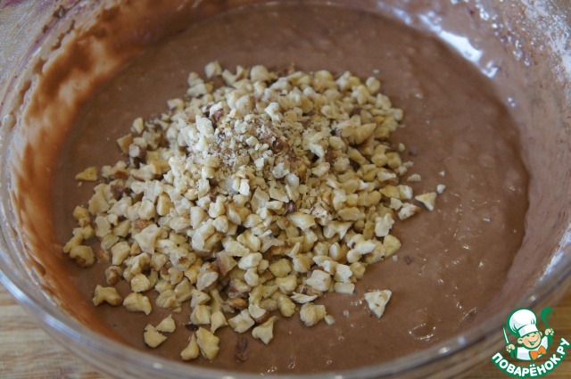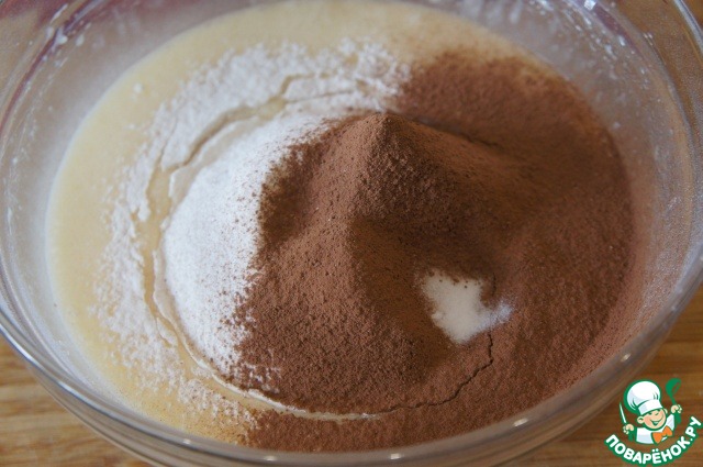 Сверху просеять муку, смешанную с разрыхлителем и какао.