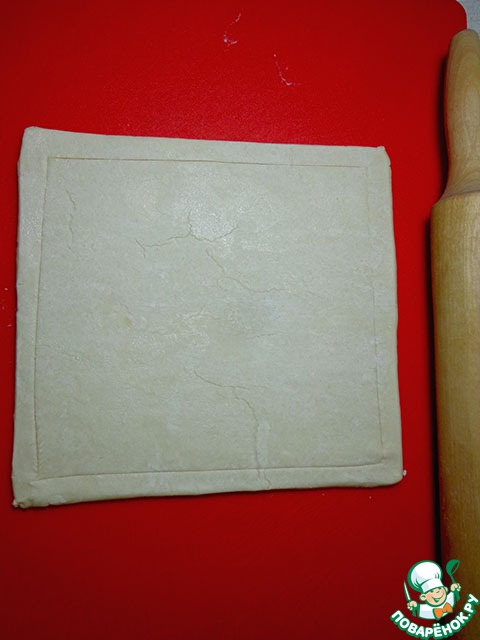 Тесто разморозить, можно слегка раскатать. Лучше это делать сразу на бумаге для выпечки. По краю провести линию острым ножом, прорезая только верхний слой.