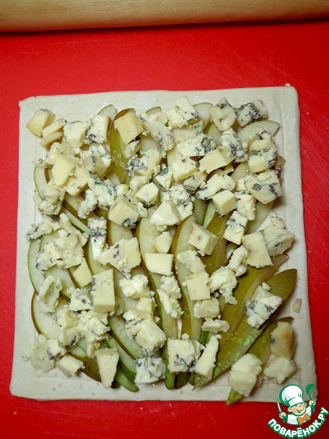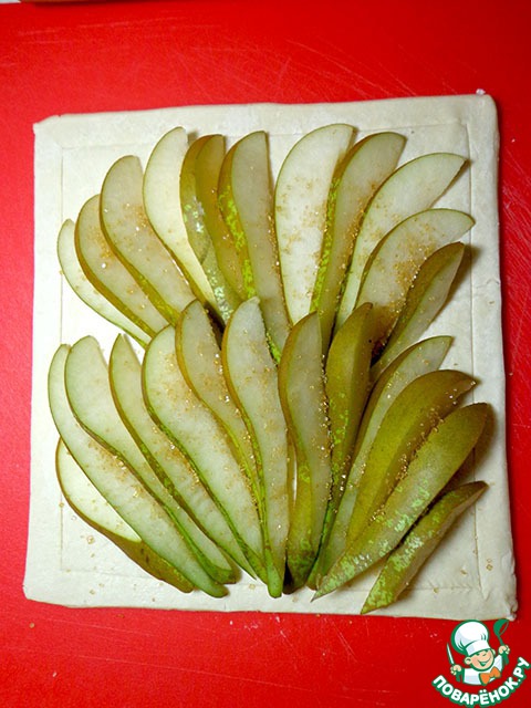 Груши режем тонкими пластинками. У меня они были ооочень маленькие, потому так много, а если среднего размера, то хватит пары штук.