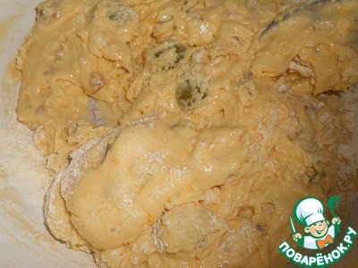 добавить измельченные орехи, добавить две горсти винограда, добавить муку и перемешать