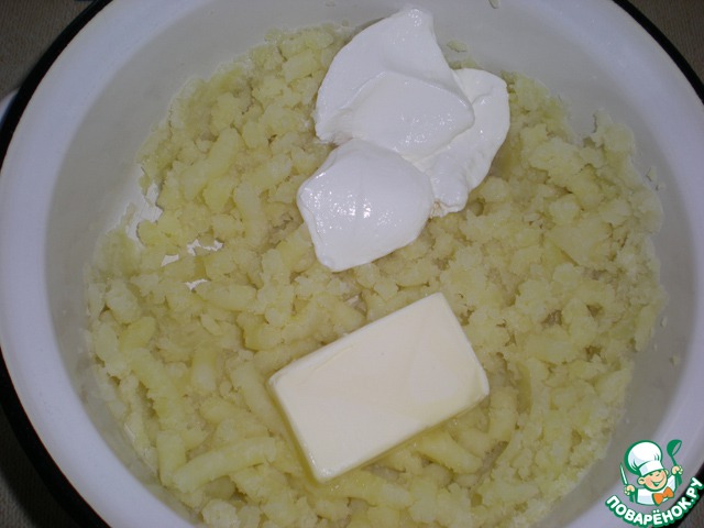 Для основы пирога нам понадобится картофельное пюре. Вернее, даже не пюре, а отваренный картофель, с которого слили воду и размяли. В теплый картофель мы добавляем сливочное масло и сметану, посолим по вкусу и хорошенько вымешиваем.