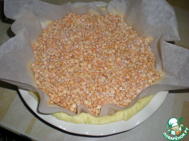 Чтобы основа пирога не осталась недопеченной, я обычно предварительно пеку ее без начинки некоторое время. Для этого нужно выстелить на тесто бумагу для выпечки и насыпать в нее груз. В роли груза у меня дежурный горох. Я обычно после выполнения им функций груза, охлаждаю его и ссыпаю в баночку до следующего раза. Этот горох побывал в духовке уже раз 10 и по-прежнему хорош!