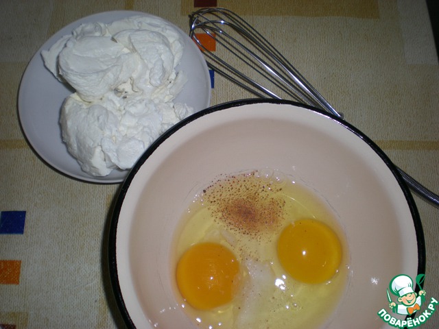 Творог пробить блендером и добавить в него взбитые 2 яйца с солью, манкой и мускатным орехом.
