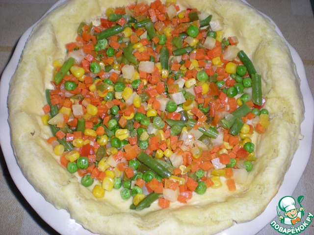 Теперь нужно достать основу пирога и равномерно по ней распределить овощную смесь.
