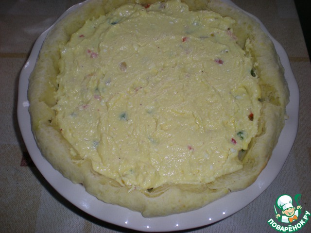 Потом распределить заливку из творога. И отправить пирог снова в духовку еще на 20-25 минут.