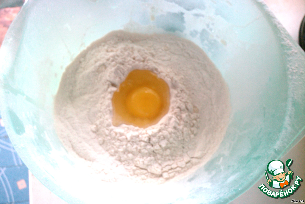 Сначала из муки формируем горку и добавляем в нее яйцо