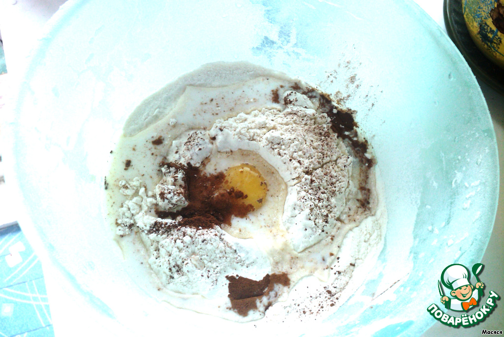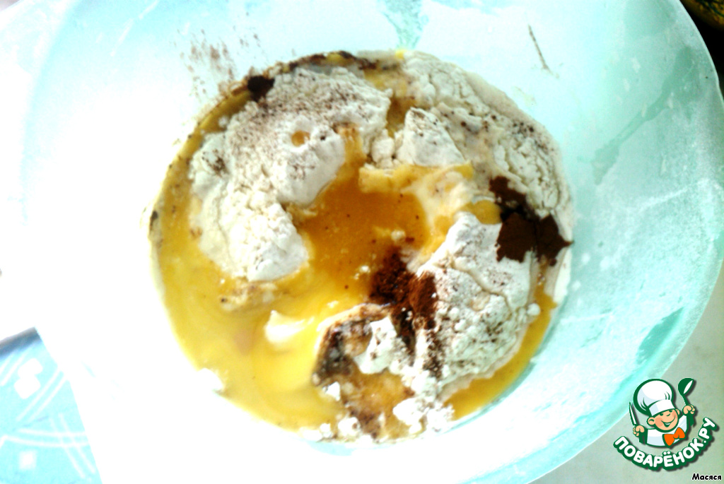 Тесто делим на две части. В одну добавляем какао, другую оставляем белой.