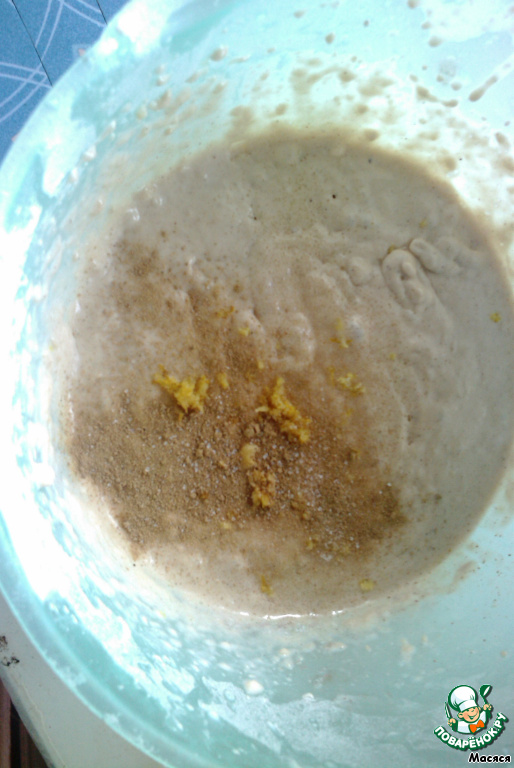 Туда же добавляем цедру и имбирь. Все хорошо перемешиваем ложкой или миксером.