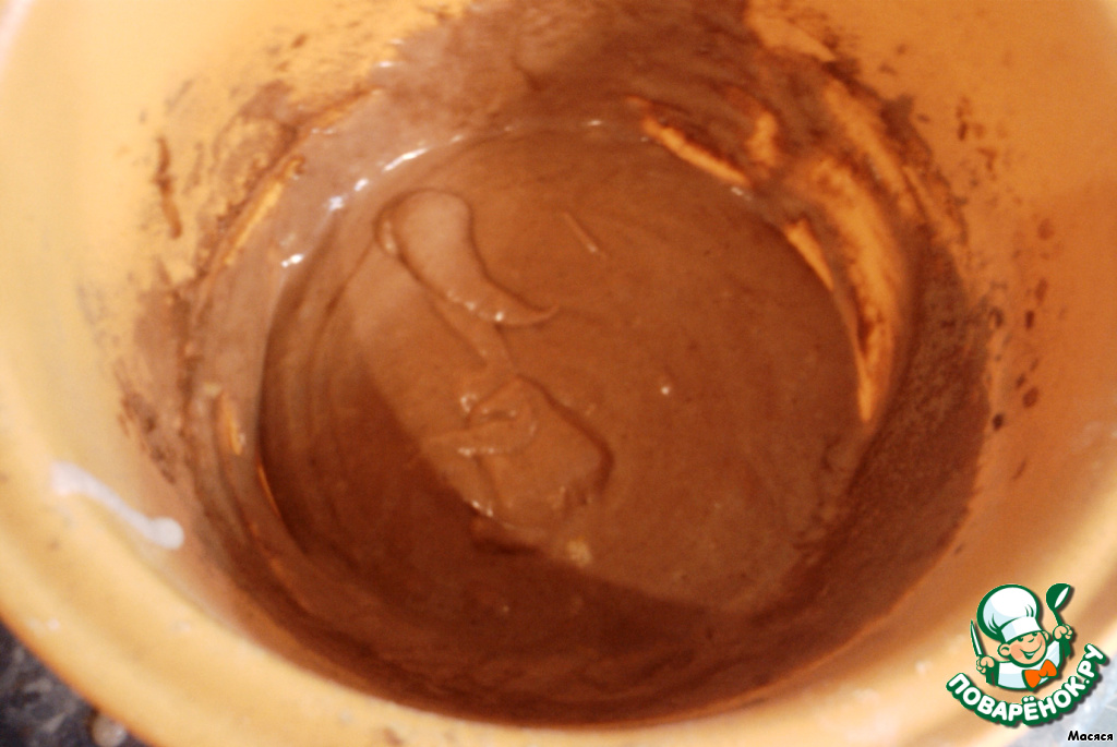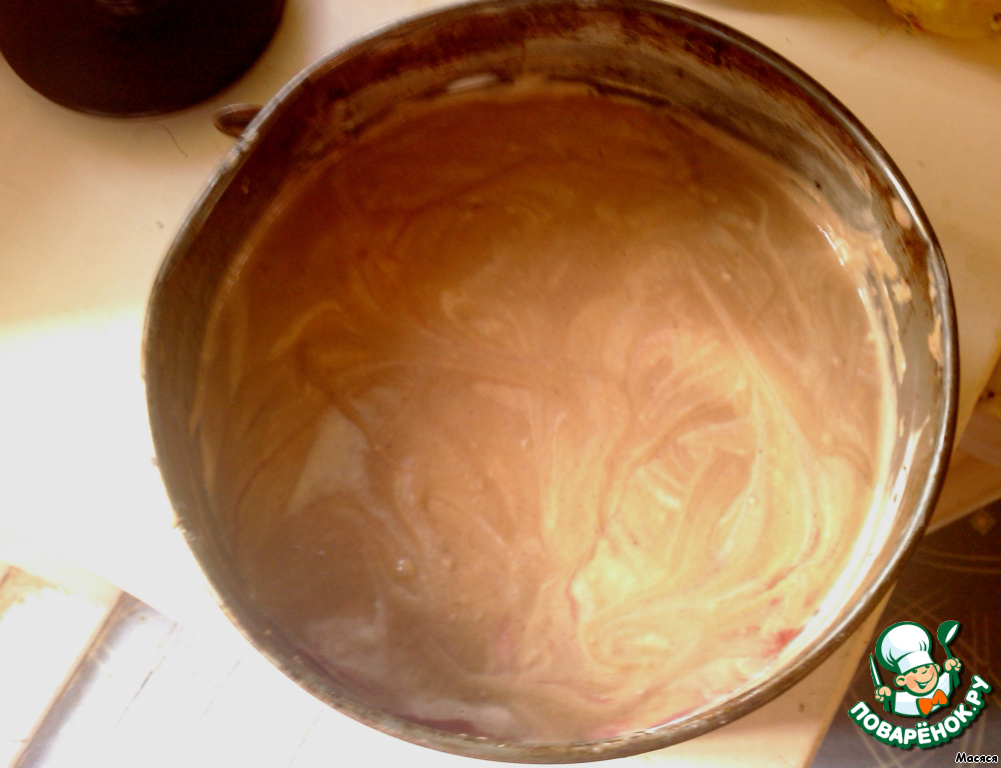 Форму смазываем сливочным маслом и по очереди выкладываем белое и шоколадное тесто, делая разводы