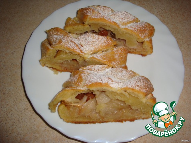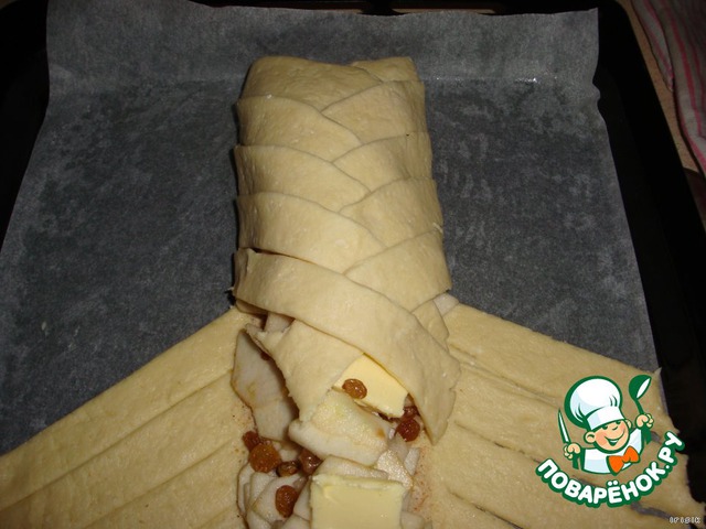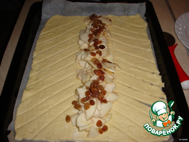 На тесто выкладываем яблоки с изюмом и кусочки масла.