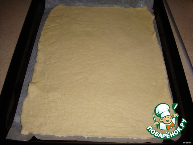 И переносим аккуратно тесто на противень, выстеленный бумагой для выпекания.