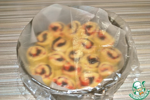 9) Оставшееся тесто делим на 2 части и раскатываем в прямоугольник 45 х 20 см. Смазываем вареньем. Скручиваем рулет.