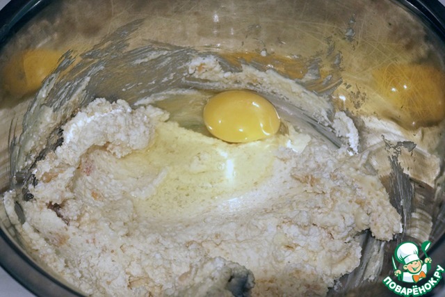 К морковному пюре добавить 2 яйца и два желтка (белки пойдут в творожную прослойку), перемешать.