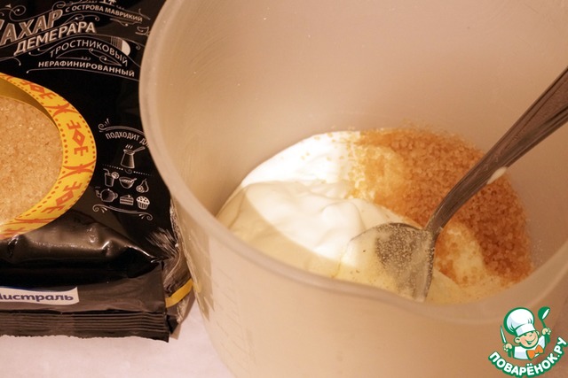 Для заливки сметану смешать с коричневым сахаром и манкой.