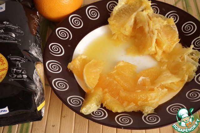 Для приготовления крема и украшения пирога 1 апельсин очистить и извлечь мякоть, сок собрать, из жмыха тоже как следует отжать сок.