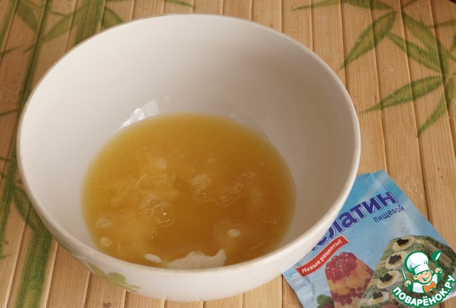 Желатин залить соком апельсина, если сока мало, можно добавить ложку воды. Разогреть желатин до растворения, не кипятить.
