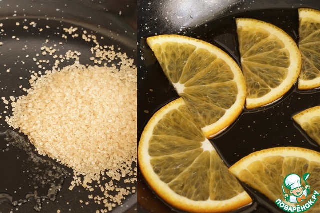 Я решила украсить розочкой из апельсина. Для этого примерно треть апельсина нарезать на ломтики, в сковороде растопить 1 ложку сахара с добавлением 1 ложки воды, проварить ломтики апельсина в сиропе минут 5, остудить. Свернуть розочкой.