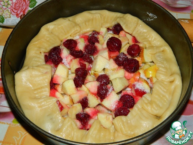 Тесто раскатываем в большой круг, в середину выкладываем нарезанные яблоки и вишни. Посыпаем сахаром. Бока теста заворачиваем на начинку. Выпекаем в разогретой духовке при температуре 200 градусов минут 30.