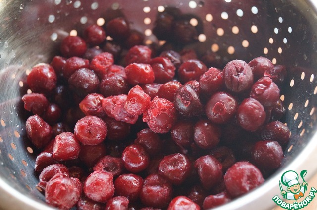 Выкладываем замороженную вишню в дуршлаг, чтобы немного размягчилась. Одновременно включаем духовку на разогрев до 180 градусов.
