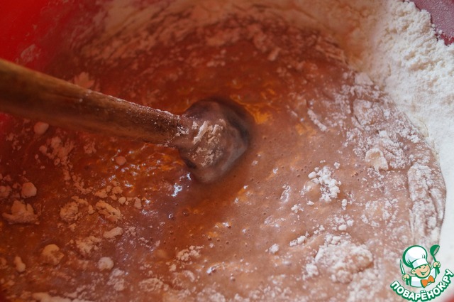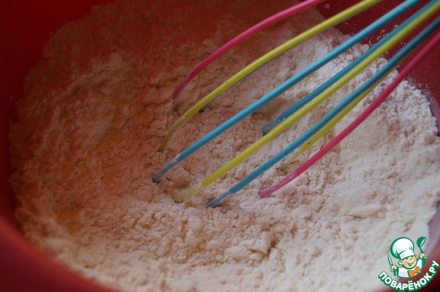 Высыпаем у глубокую сухую миску муку и разрыхлитель. Перемешиваем венчиком.