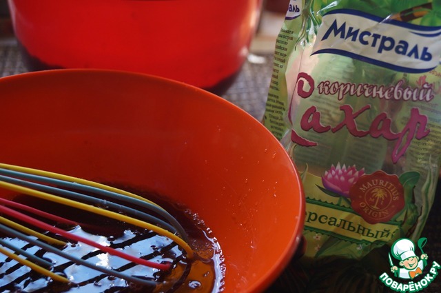 Во вторую глубокую миску выливаем сироп из вишнёвого варенья и высыпаем сахар. Перемешиваем до растворения сахара. В принципе, сироп может быть от любого варенья. Часто он остаётся после того, как из варенья вылавливаются кусочки фруктов. Так что, этот рецепт - хороший способ утилизации этого продукта.