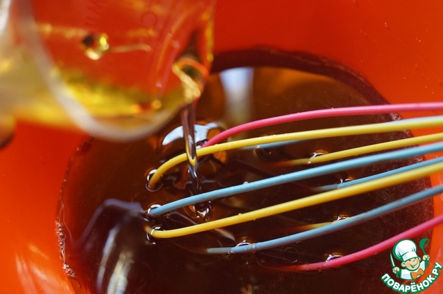 Добавляем в миску с сиропом растительное масло и воду. Перемешиваем до однородности.