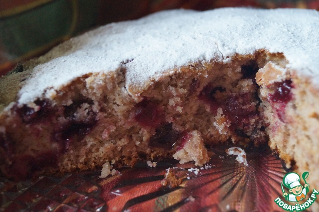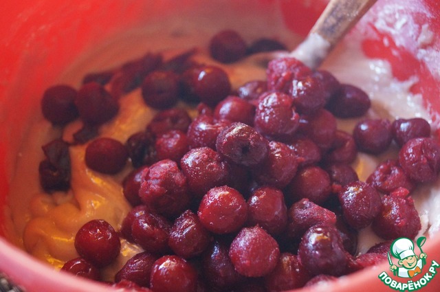 Добавляем немного размороженную вишню и аккуратно перемешиваем. Вместо замороженной, можно добавлять консервированную вишню, или любые другие ягоды и фрукты. Тесту дать постоять минут 5.