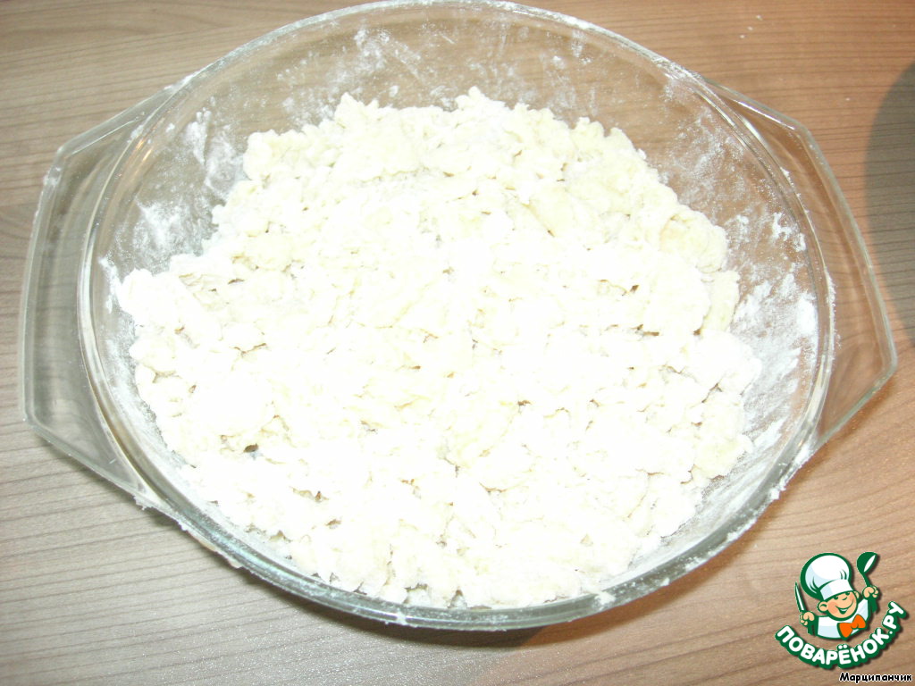 Приготовить тесто: соединить масло, муку, сахар и разрыхлитель. Растереть руками до мелкой крошки.