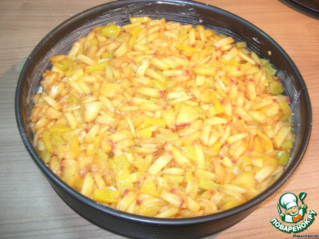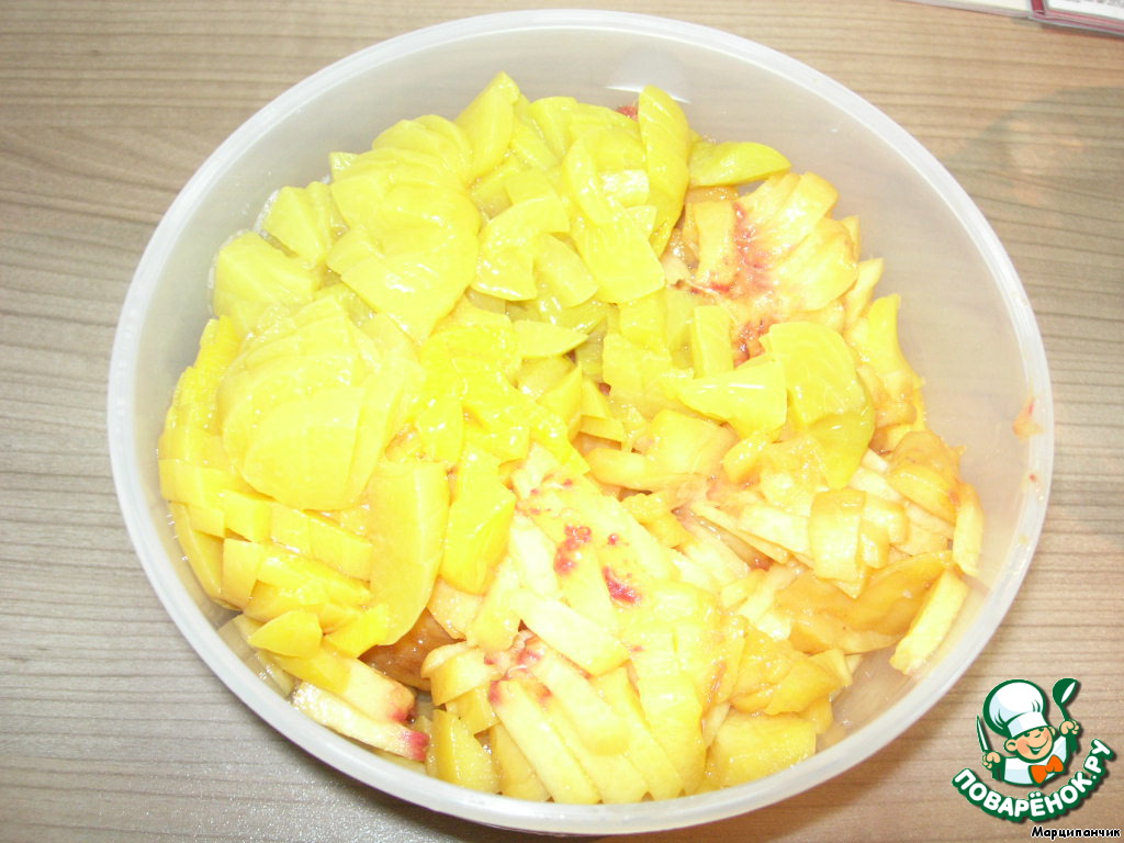 Персики нарезать небольшими кубиками (у меня были и свежие, и консервированные).