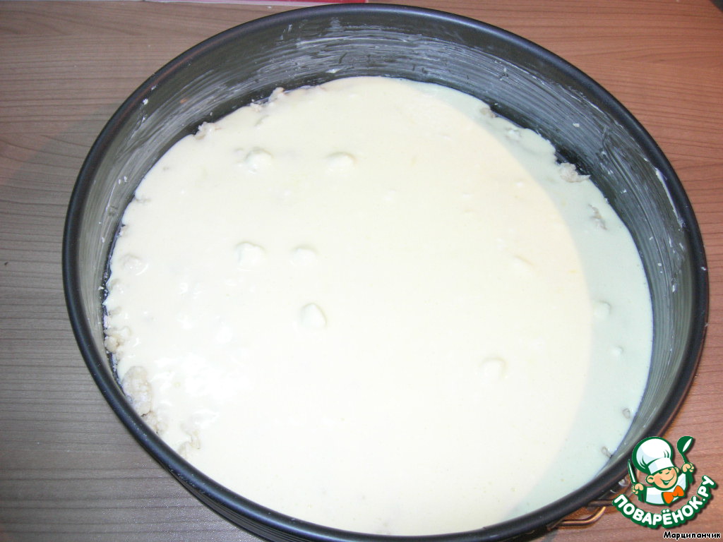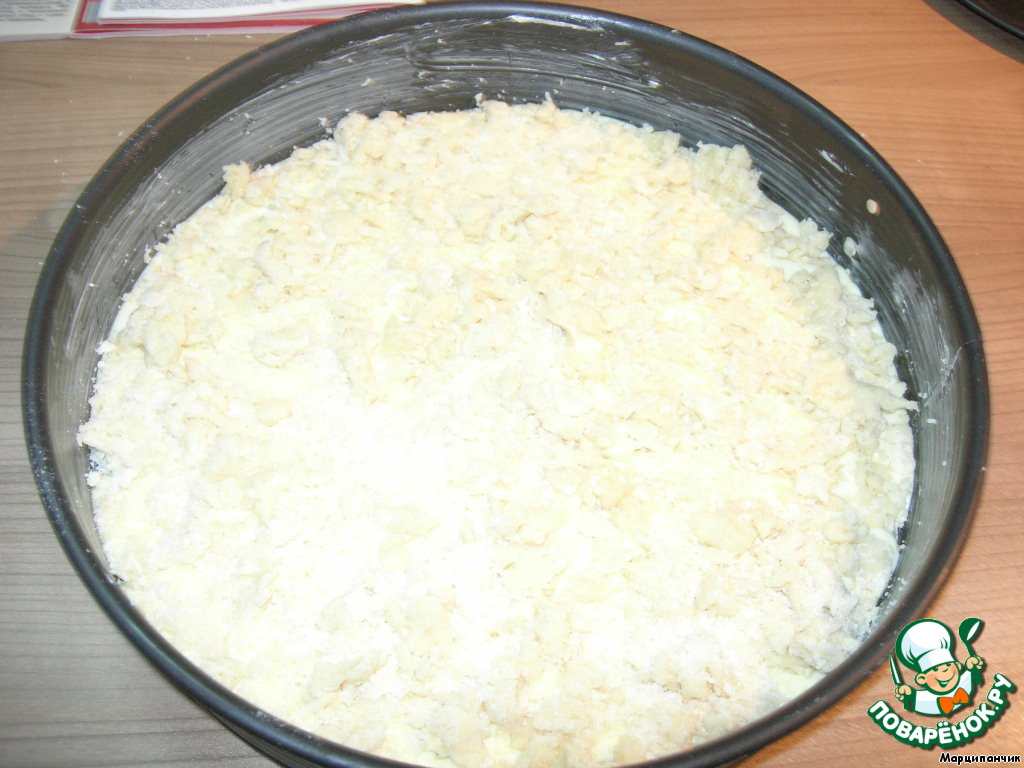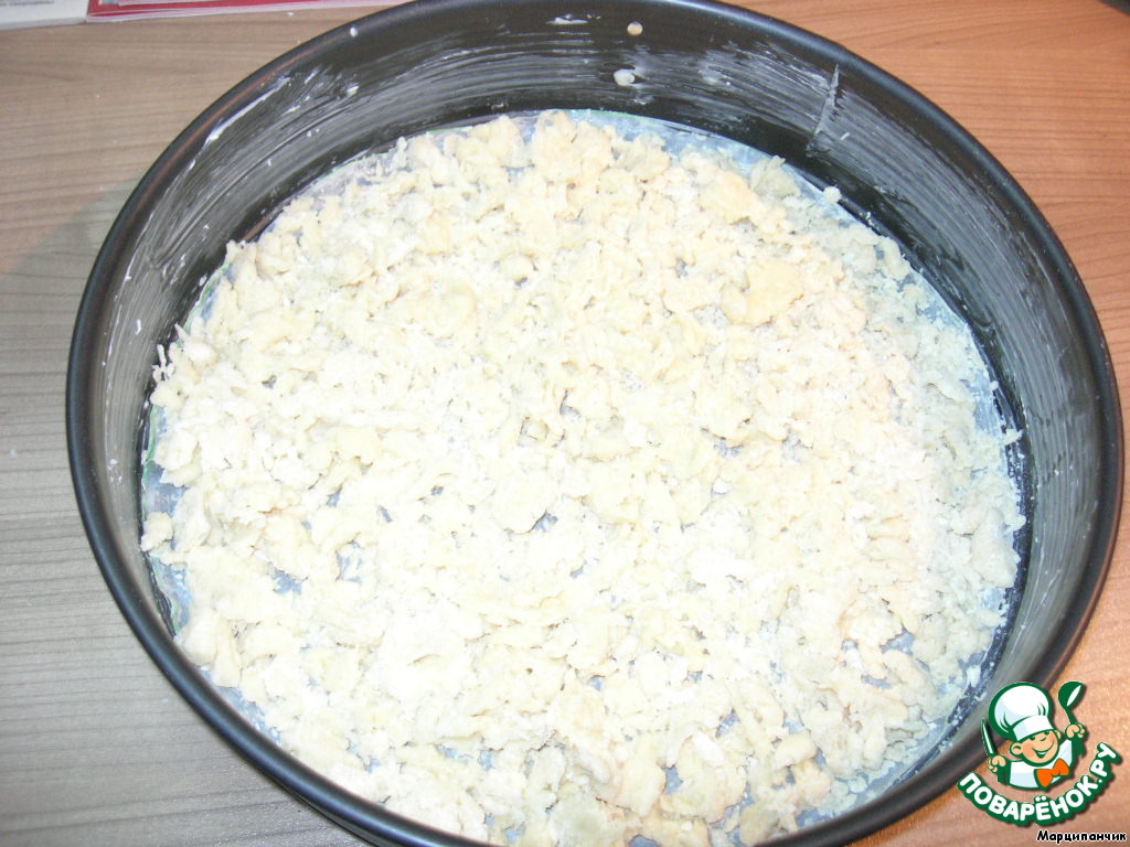 В смазанную круглую форму выкладываем слоями, сначала 1/3 крошки из теста,
