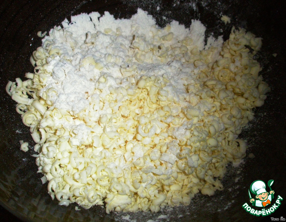 Просеем муку. Добавим в нее наструганное замороженное масло.