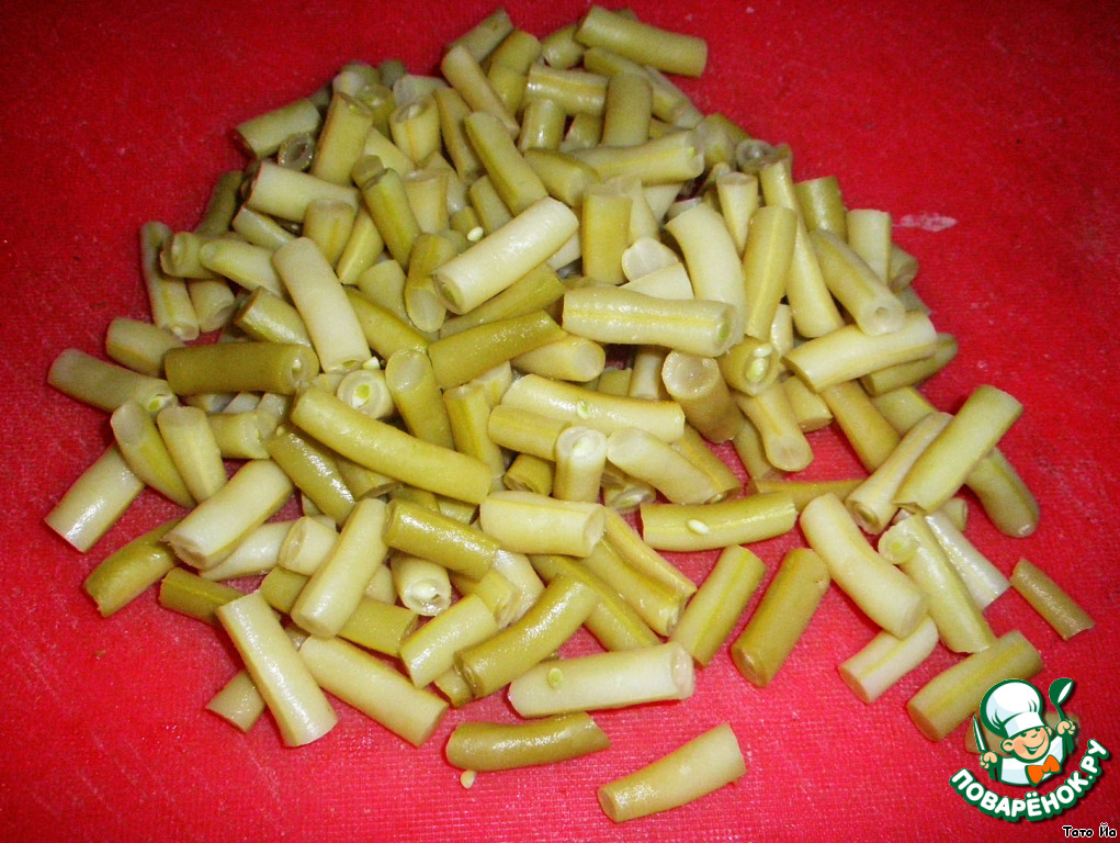 Отваренную фасоль остужаем и нарезаем на небольшие кусочки.