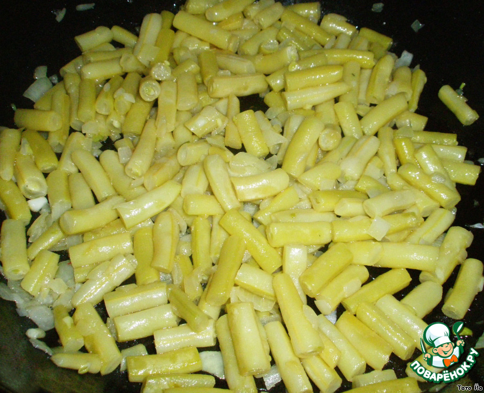 Нагреваем 1 ст.л. масла и обжариваем фасоль, добавляем лук.