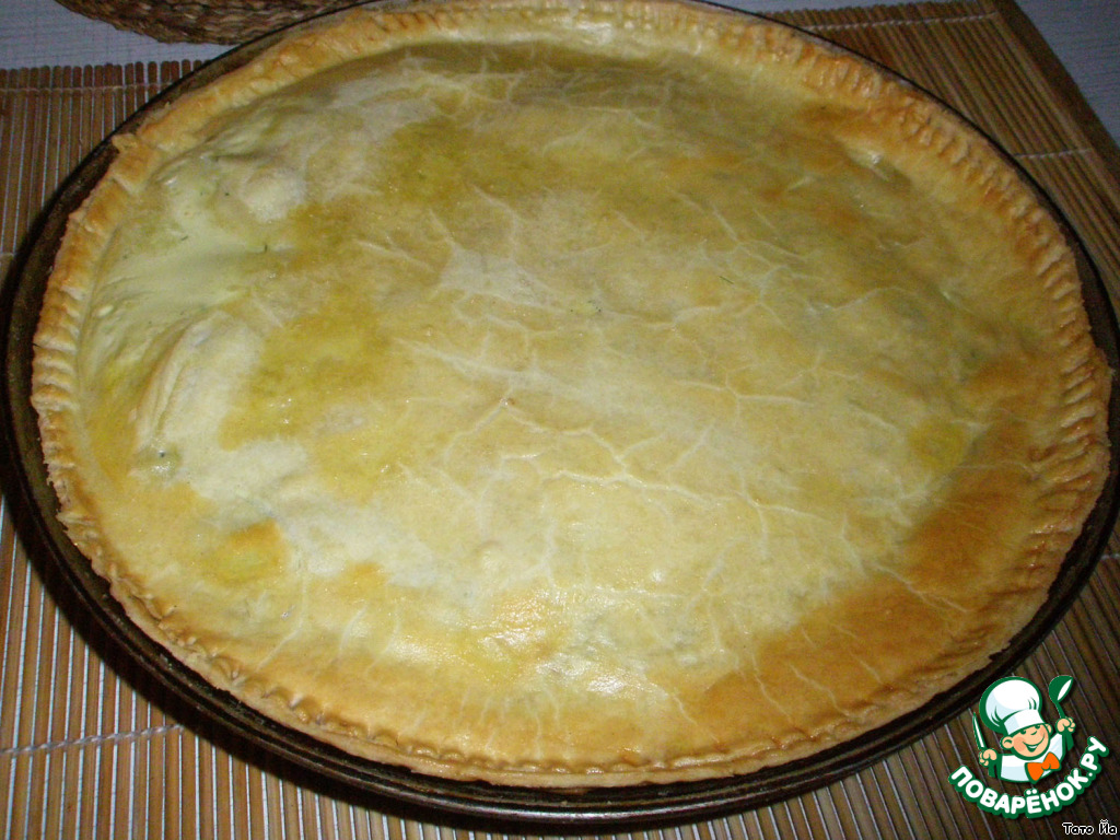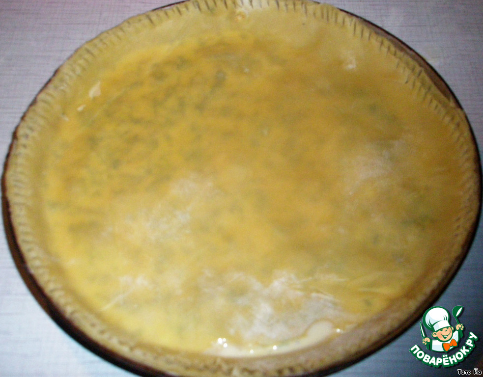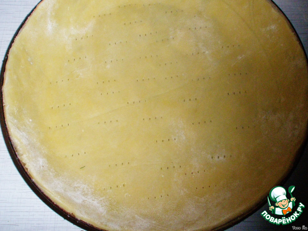 Смазываем форму для выпечки. Раскатываем тесто. Выкладываем в форму, обрезаем края. Накалываем вилочкой.