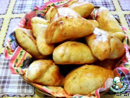 тесто делим на кусочки размером с куриное яйцо, раскатываем толщиной 0.3-0.5 см, в середину кладём по 1 ст.л. начинки и защипываем края, придав форму треугольника.