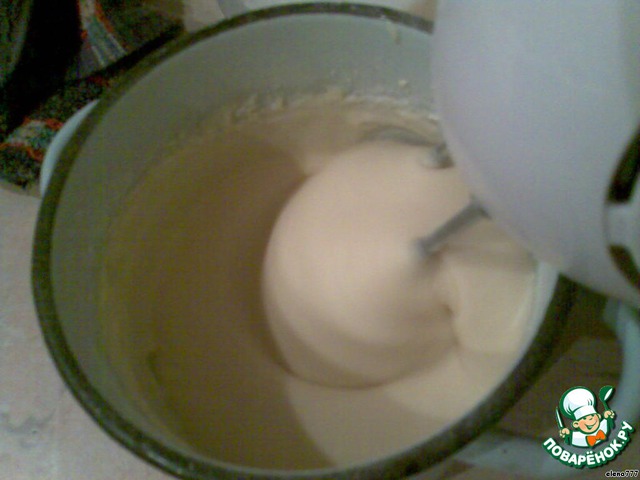 Делаем крем: сметану взбить со сгущёнкой и сахаром, добавить 1ст. л. муки с горкой, снова взбить.