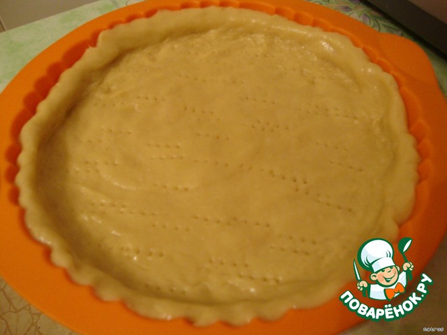 Охлажденное тесто раскатать в тонкий пласт и выложить в круглую форму с низкими бортиками, предварительно смазав ее маслом, сформировать бортики из теста. Сделать по всей поверхности теста частые проколы вилкой и поставить в духовку, разогретую до 180 гр., на 15 минут.