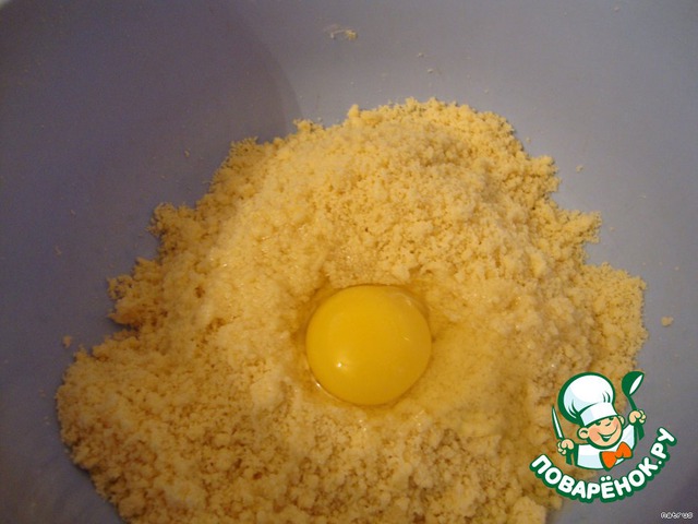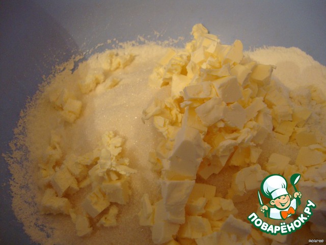 Муку просеять в миску, добавить 100 г сахара и масло. Перетирать руками до состояния крошки.